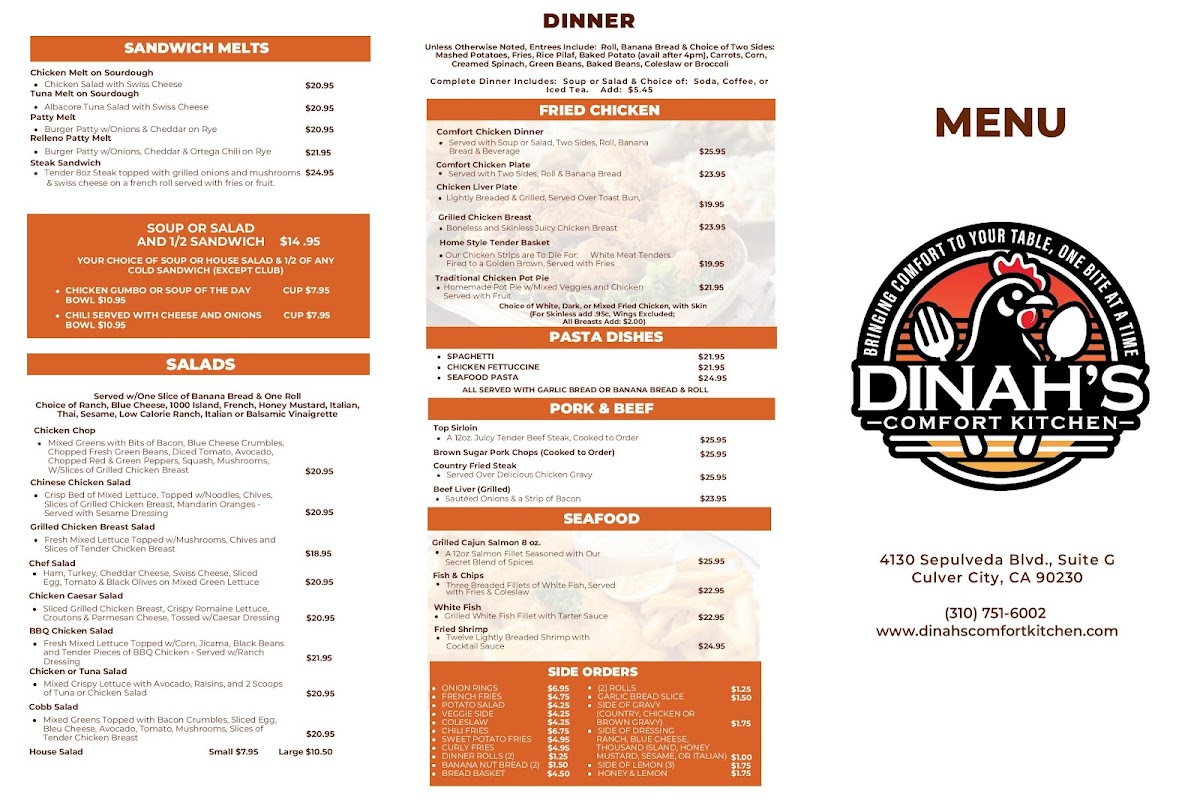 Welcome to Dinah's Comfort Kitchen, a delightful dining haven located at 4130 Sepulveda Blvd G, Culver City, CA. This restaurant pays homage to traditional American diner culture, offering a cozy atmosphere that's perfect for families, friends, or anyone seeking heartfelt comfort food. The updated decor retains the charming essence of the classic 50s diner while embracing a fresh, modern twist that makes it a delightful spot to enjoy a meal.