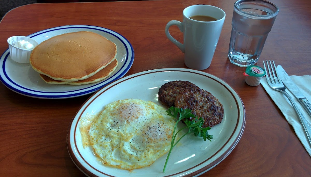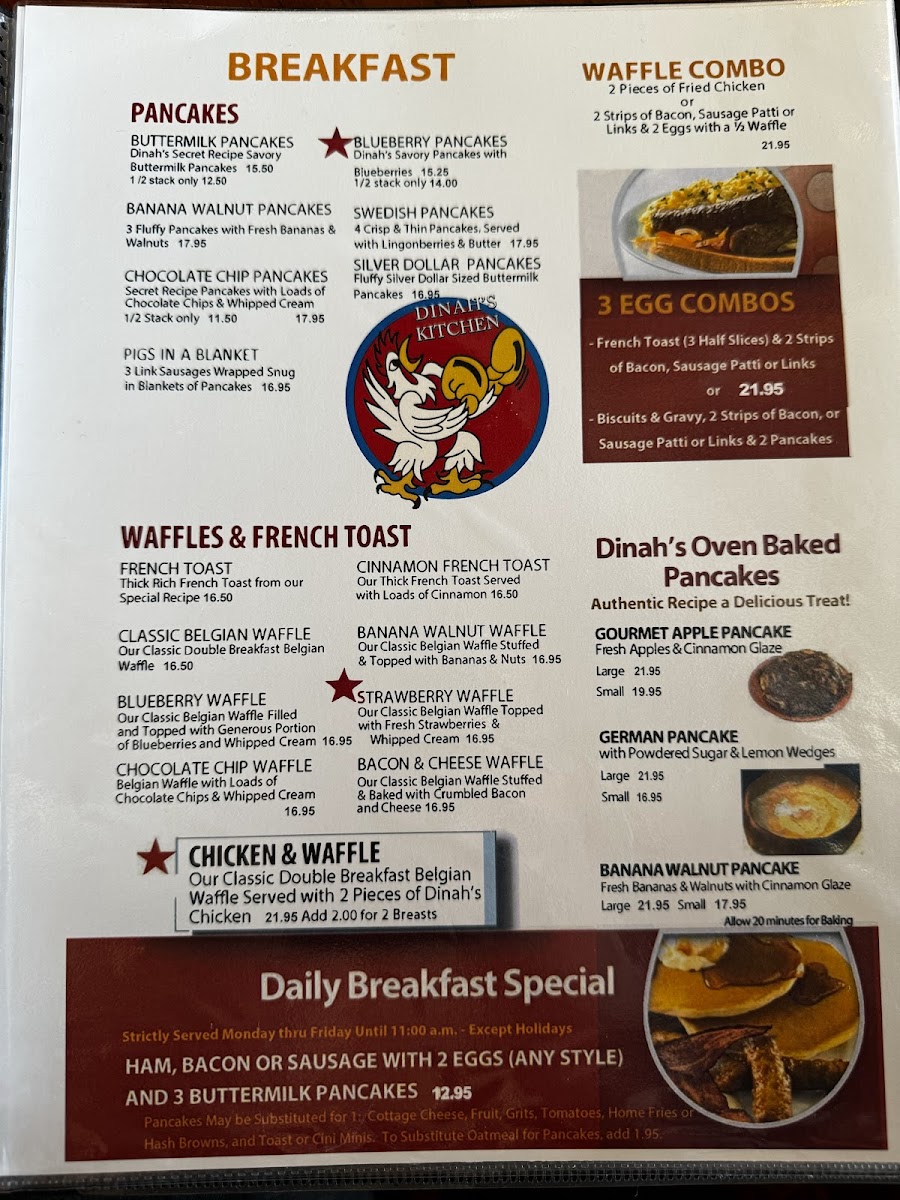 This is the updated Dinah's. Lovely decor. Miss the original, however, the food and service is better than ever. Blueberry pancakes were amazing all 7 or so large ones. Ham steaks and eggs and pancakes were wonderful. Coffee and water were brought constantly.